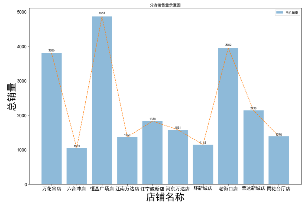 def autolabel(bars):for bar in bars:height = bar.get_height()plt.text(bar.get_x()+bar.get_width()/2, 1.012*height, str(height), size=10, ha='center')plt.figure(figsize=(15,10))plt.plot(gb_shop_name_df['店铺名称'], gb_shop_name_df['数量'], c='tab:orange', ls='--') # 添加折线图bar_chart = plt.bar(gb_shop_name_df['店铺名称'], gb_shop_name_df['数量'], alpha=0.5, label='手机销量')autolabel(bar_chart)plt.legend()plt.xlabel('店铺名称', fontsize=30)plt.ylabel('总销量', fontsize=30)plt.title('分店销售量示意图')plt.tick_params(labelsize=15)plt.show()