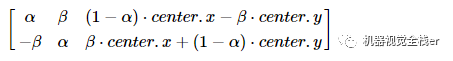 但是OpenCV提供了可调节旋转中心的缩放旋转,因此你可以在你喜欢的任何位置进行旋转。修改后的变换矩阵是这样的