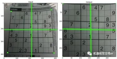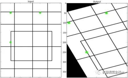 对于透视变换,你需要一个3x3的变换矩阵。直线在变换后仍会保持直线。要找到这个变换矩阵,你需要输入图像上的4个点和输出图像上的对应点。在这4个点中,有3个不应该是相邻的。然后可以通过函数cv.getPerspectiveTransform找到变换矩阵。然后用这个3x3的变换矩阵应用cv.warpPerspective。