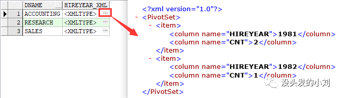 SELECT *FROM (SELECT d.dname, to_char(e.hiredate, 'yyyy') hireyearFROM emp e, dept dWHERE d.deptno = e.deptno)pivot xml(COUNT(1) AS cntFOR hireyear IN(ANY));
