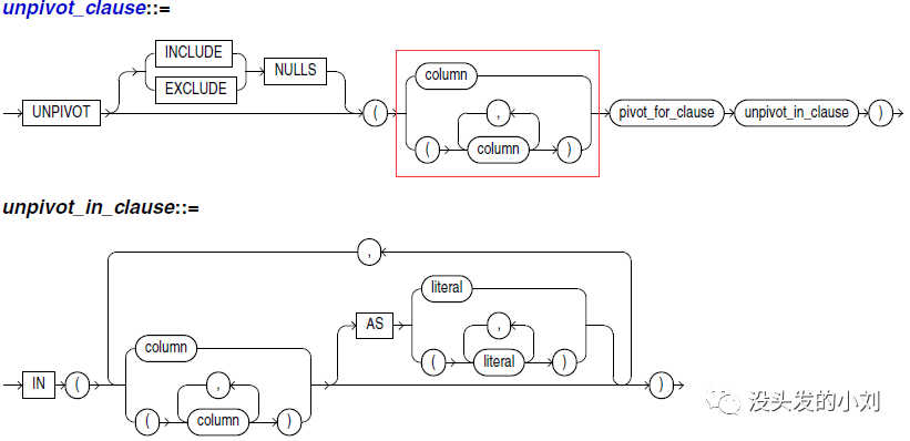 同理,语法结构图中的 unpivot_clause 对应轨道图中圈出的部分,unpivot_for_clause 对应轨道图中的 pivot_for_clause