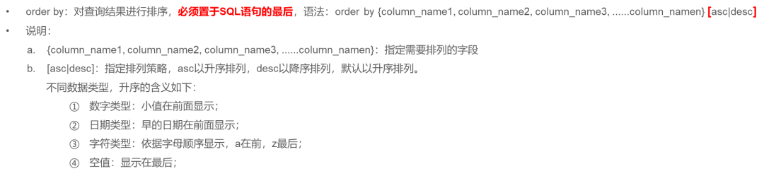 order by:对查询结果进行排序,必须置于SQL语句的最后,语法:order by {column_name1,