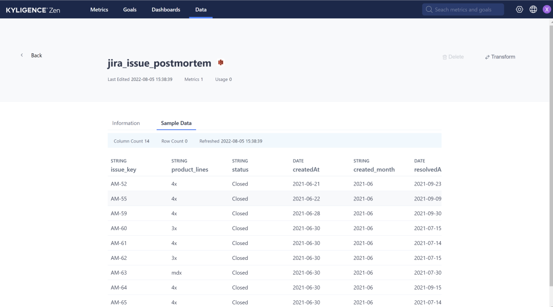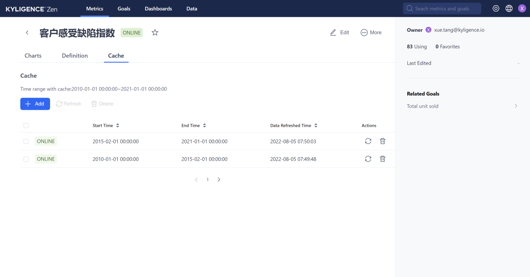 可信的指标数据、可交互的使用体验是数据辅助决策的前置要求。我们通过 ETL 将 Jira 等系统数据清理整合后放置在 Amazon S3 上,定时更新,再借助 Kyligence Zen 直连 S3 的能力,来获取数据、定义指标。Jira 的数据量相对较大,为了达到可交互的分析体验,我们通过 Kyligence Zen 指标自动化能力,界面开启指标 Cache,一键获取加速体验。Kyligence Zen 的指标自动化能力 Smart Cache,依托了 Kyligence 专利的 AI 增强引擎,动态提取最新的指标表、维度等信息,快速生成推荐模型,并触发构建,极大降低指标计算的运维成本。