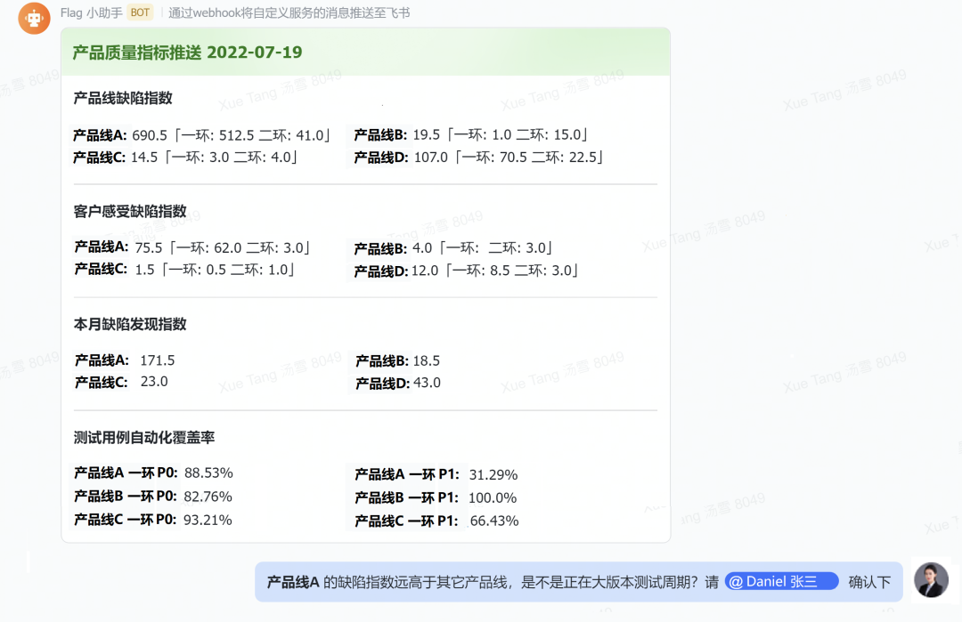 Kyligence Zen 提供标准查询 API 接口,将指标数据推送至下游业务应用,既可以复用指标数据,又能快速为业务决策赋能。研发团队借助于指标 API 能力,将效能指标数据定时推送至飞书的群聊机器人,让相关者随时随地都能接收到最新动态,直接在群聊里分派任务、业务决策。