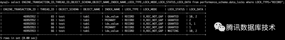 # 表结构和表数据CREATE TABLE `tab1` (`id` bigint unsigned NOT NULL AUTO_INCREMENT,`value` int NOT NULL,`status` tinyint unsigned NOT NULL DEFAULT '1',PRIMARY KEY (`id`),KEY `idx_value` (`value`));insert into tab1 (value) values (5);insert into tab1 (value) values (10);#seesion 1:begin;update `tab1` set `status` = 3 where (`value` = 10);#session 2:update `tab1` set `status` = 3 where (`value` >= 4) and (`value` < 6); #阻塞