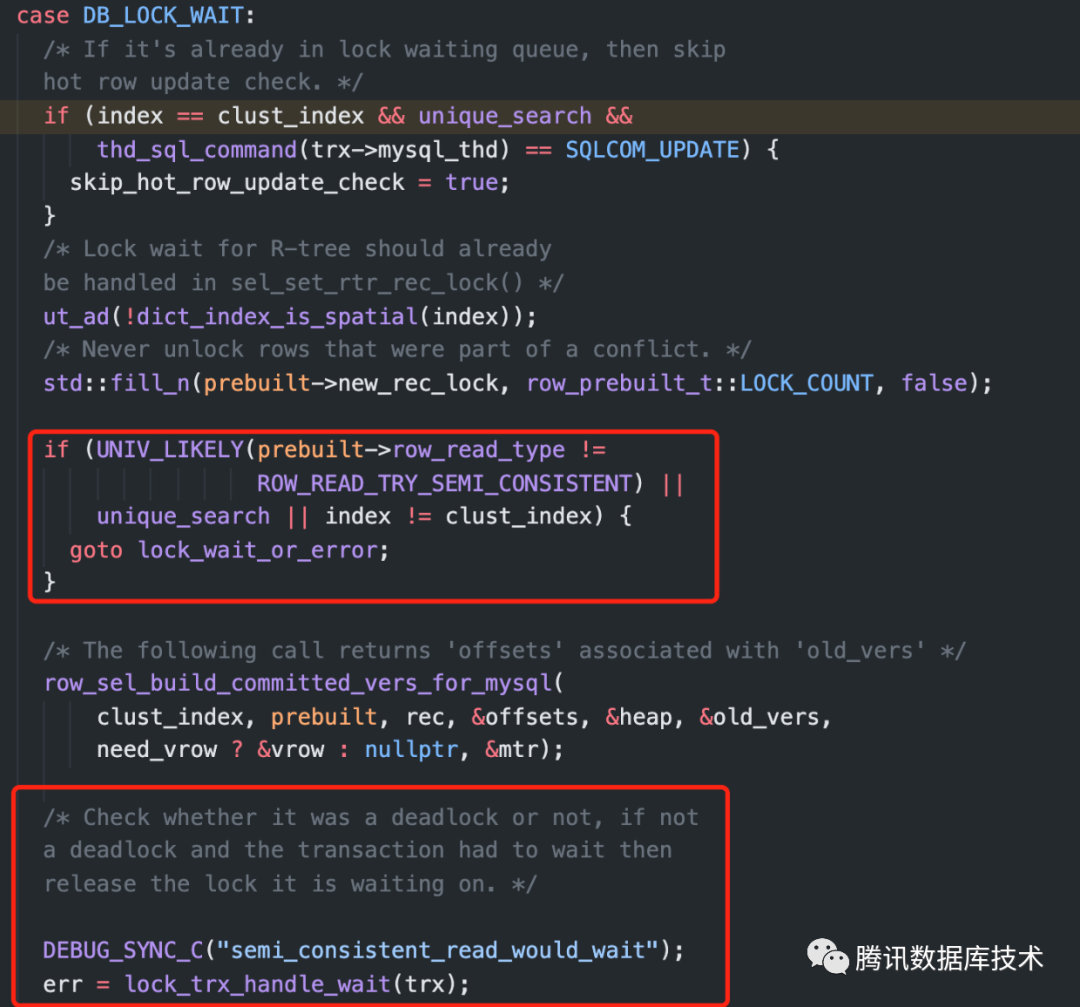 如果是select for update主键索引, prebuilt->row_read_type=ROW_READ_WITH_LOCKS,在innodb层的row_search_mvcc函数中,发生锁等待的时候,由于prebuilt→row_read_type != ROW_READ_TRY_SEMI_CONSISTENT,会和secondary index一样走lock_wait_or_error进行等待(下图第一个红框内的代码)。