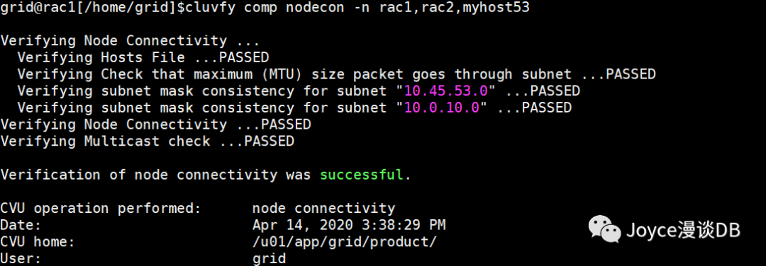 cluvfy comp nodecon -n rac1,rac2,myhost53