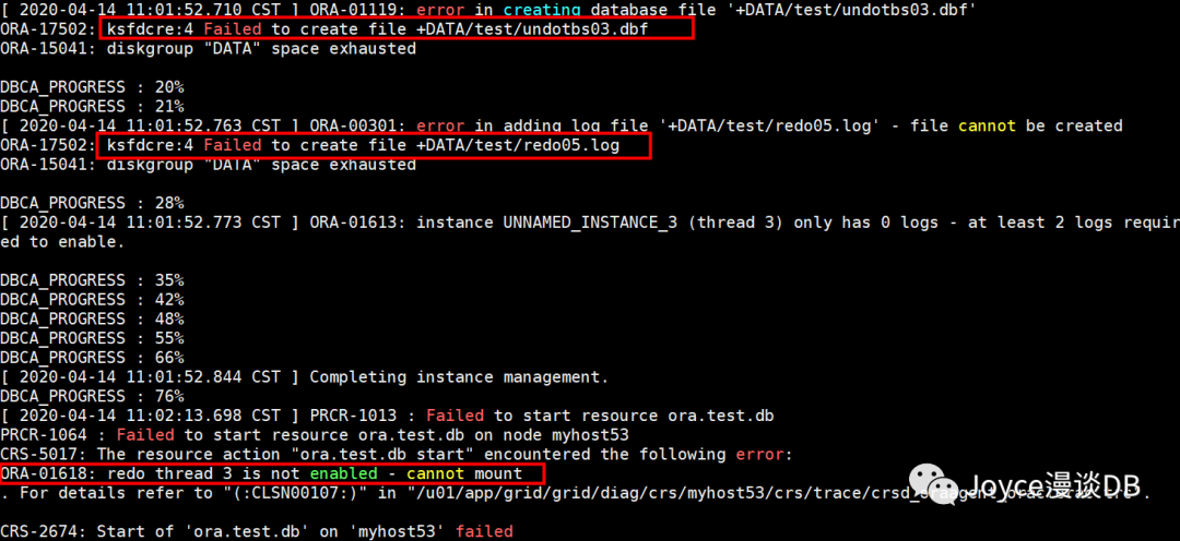 添加instance的过程中,会在新节点的test3实例中添加redo和undo,并起实例,由于我的asm盘满了,dbca过程中显示成功但是日志报如下错误