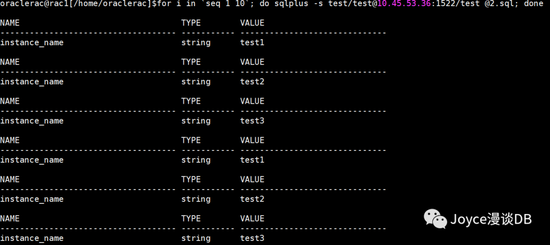 for i in `seq 1 10`; do sqlplus -s test/test@10.45.53.36:1522/test @2.sql; done