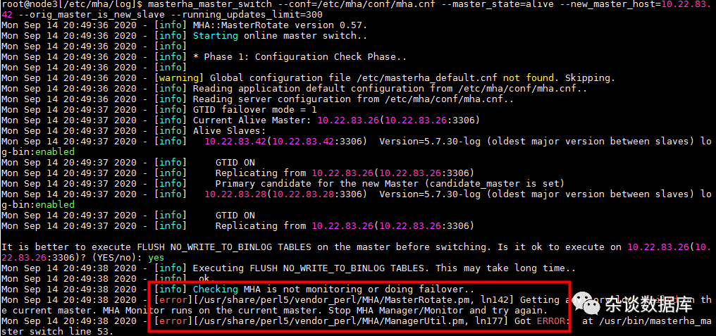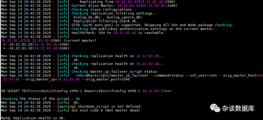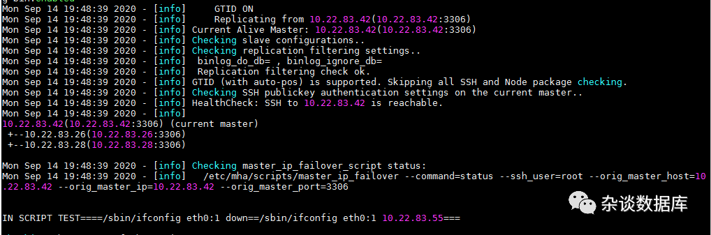 Mon Sep 14 20:09:07 2020 - [info] /etc/mha/scripts/master_ip_failover --command=start --ssh_user=root --orig_master_host=10.22.83.42 --orig_master_ip=10.22.83.42 --orig_master_port=3306 --new_master_host=10.22.83.26 --new_master_ip=10.22.83.26 --new_master_port=3306 --new_master_user='root' --new_master_password=xxx