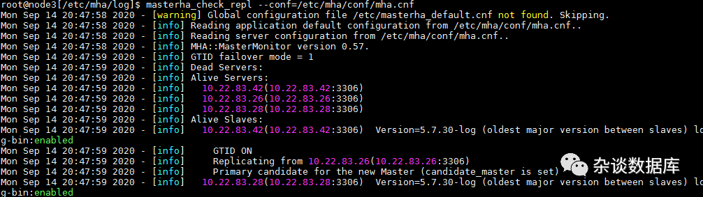 Mon Sep 14 20:09:07 2020 - [info] 10.22.83.26(10.22.83.26:3306) Version=5.7.30-log (oldest major version between slaves) log-bin:enabled