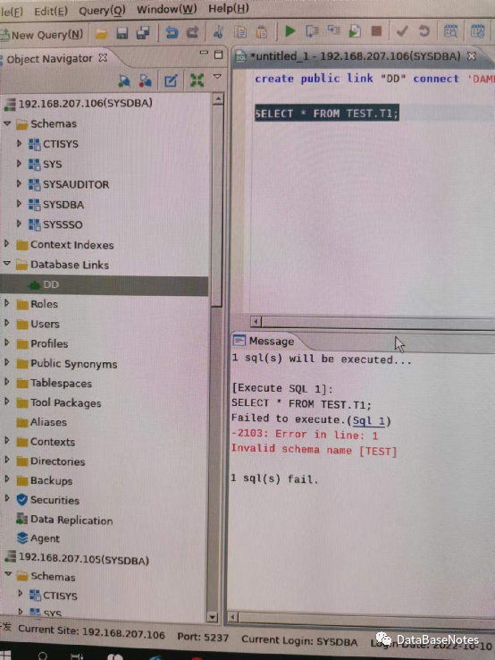 测试select * from TEST.T1@DD; 如图,符合预期