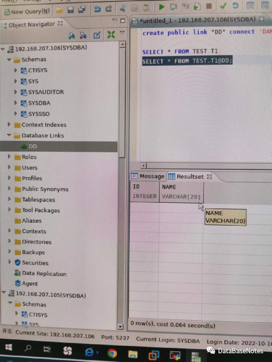 1. 在database links 右键 DD,test(T) ,弹出如下图所示,证明dblink ok