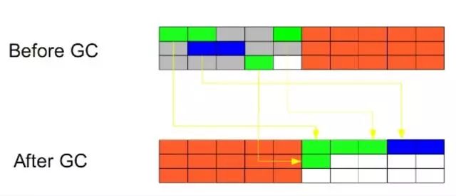 标记-整理(Mark-Compact):此算法结合了“标记-清除”和“复制”两个算法的优点。也是分两阶段,第一阶段从根节点开始标记所有被引用对象,第二阶段遍历整个堆,清除标记对 象,并未标记对象并且把存活对象“压缩”到堆的其中一块,按顺序排放。此算法避免了“标 记-清除”的碎片问题,同时也避免了“复制”算法的空间问题。
