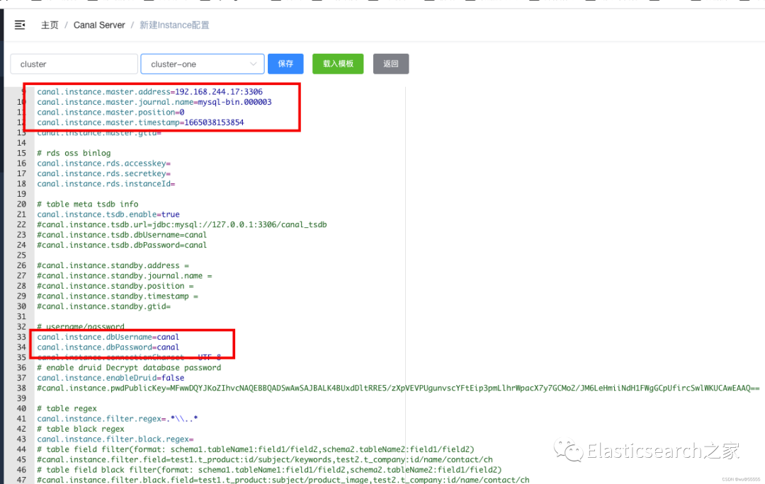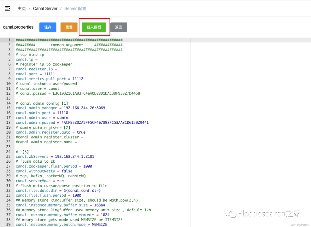 # canal admin config【1】canal.admin.manager = 192.168.244.26:8089# admin auto register【2】canal.admin.register.auto = truecanal.admin.register.cluster = cluster-one# 【3】canal.zkServers = 192.168.244.1:2181# 【4】#canal.instance.global.spring.xml = classpath:spring/memory-instance.xml#canal.instance.global.spring.xml = classpath:spring/file-instance.xmlcanal.instance.global.spring.xml = classpath:spring/default-instance.xml