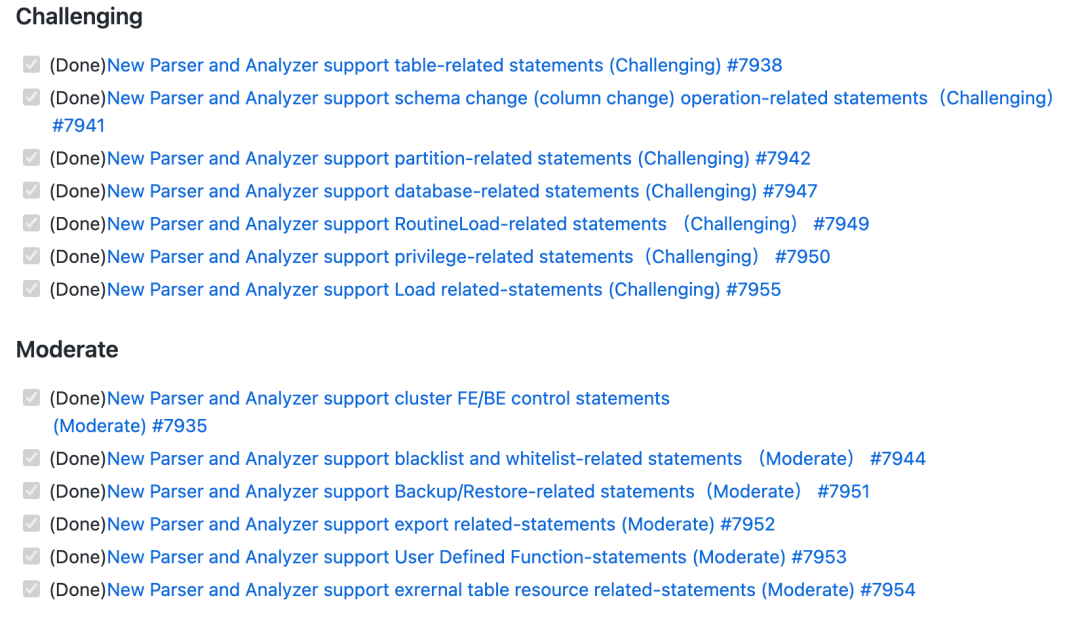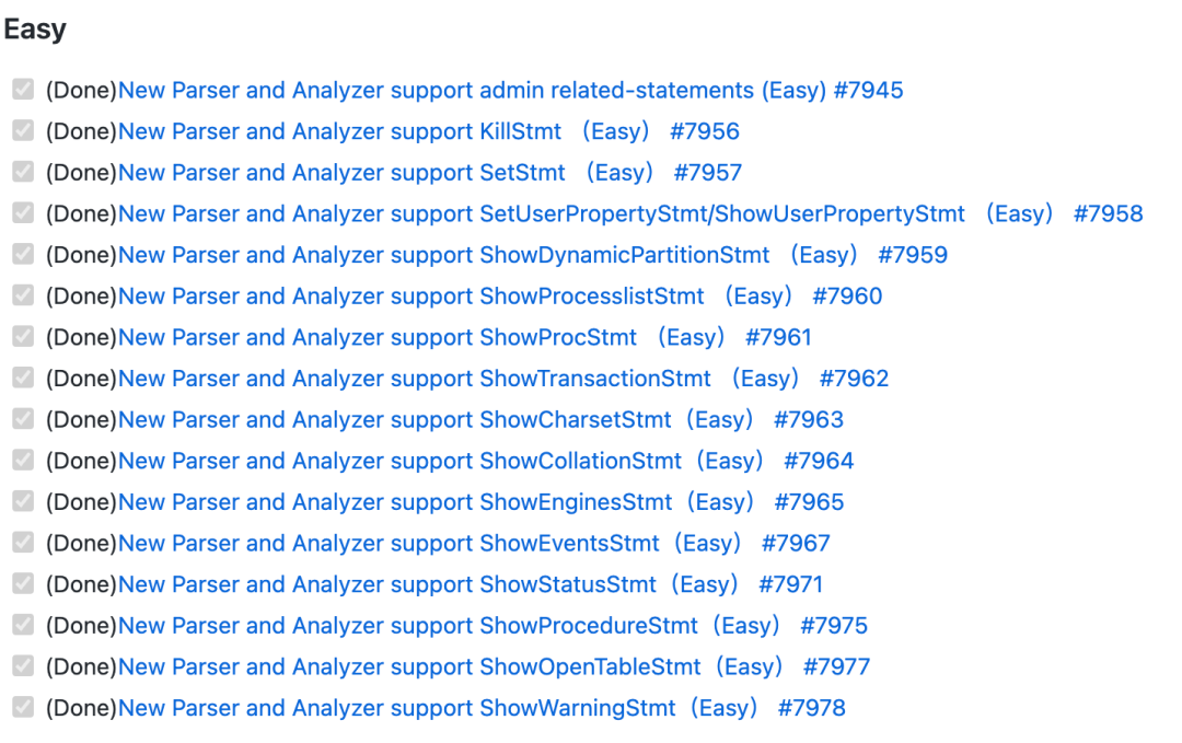 在本季活动中,StarRocks 选取了 Parser 和 Analyzer 方向的 29 个开发任务开放至社区,供社区新人开发者通过相对简单的任务,了解 StarRocks Planner 的具体实现和设计核心;同时广开思路,让 StarRocks 生成更优的 Plan。
