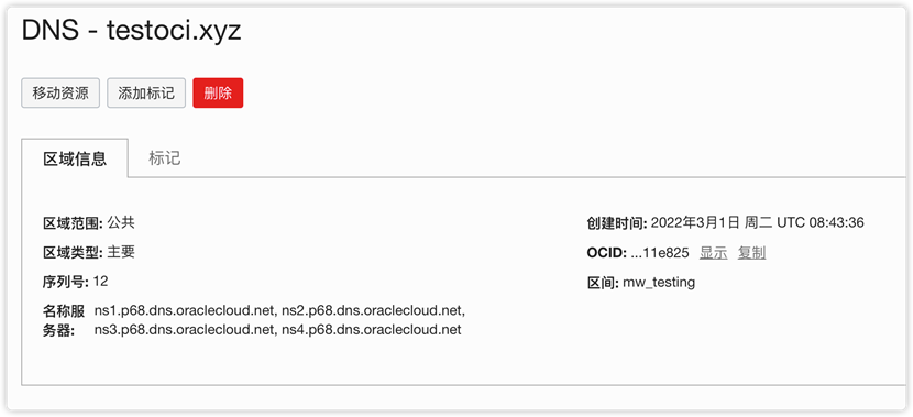 使用申请好的testoci.xyz域名, 托管在OCI DNS服务上
