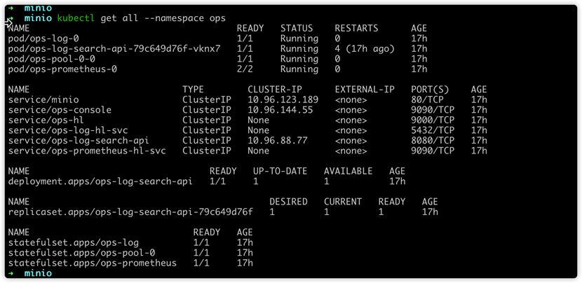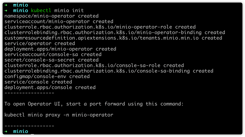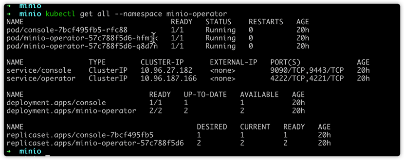 验证安装我们可以使用kubectl get all --namespace minio-operator命令,如果您使用自定义命名空间初始化 Operator,请替换 minio-operator为该命名空间。