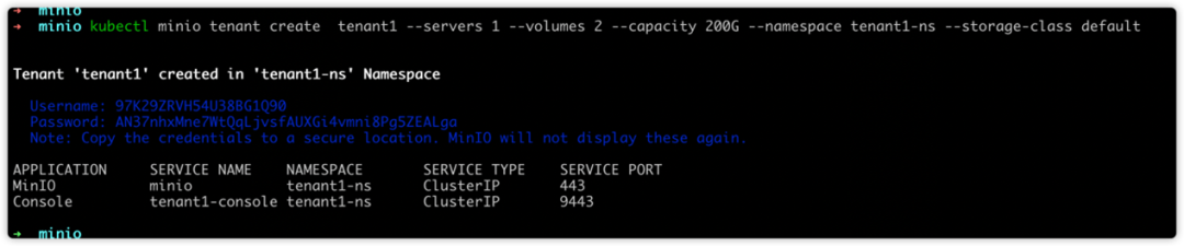 我们可以使用kubectl minio tenant create创建minio租户,我们使用如下命令创建一个一个节点的minio租户,4个存储,总容量为4Gi