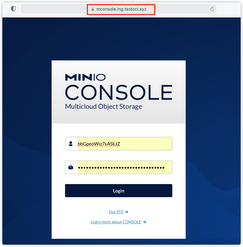租户的管理用户名和密码。将这些凭据存储在安全位置,例如受密码保护的密钥管理器。MinIO不再显示这些凭据。
