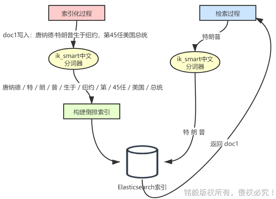 如下图所示,可以分两部分看:数据的写入过程、数据检索过程。