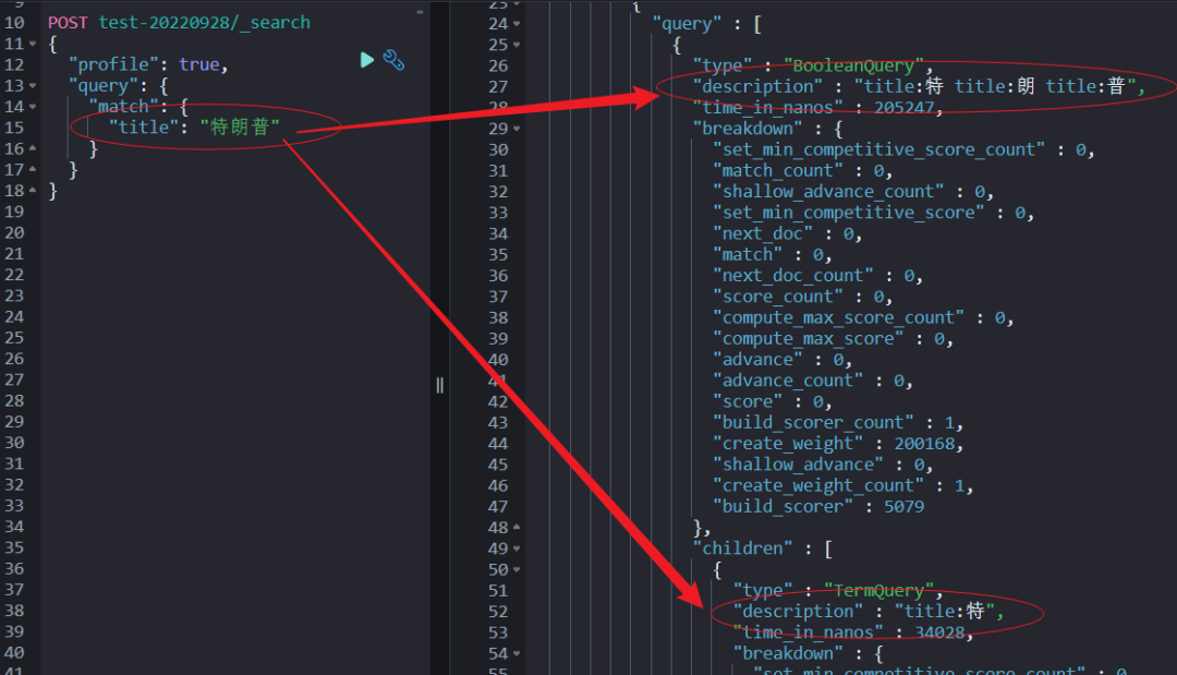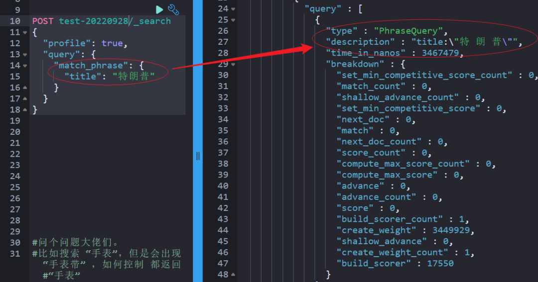 match_phrase 和 match 等实现检索的机制是不一样的,“profile:true" API 能帮我们更精细的看到底层的实现。