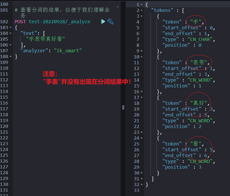 先看“手表带真好看”这个文档 ik_smart 的分词结果。