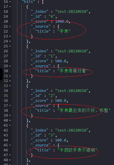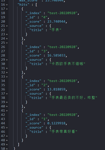 其他几个文档{“2”,“3”,“4”} 都包含手表的分词,大家可以自己验证,篇幅原因,没有截图。