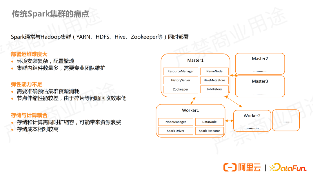 传统 Spark 集群既要部署HDFS 的 data node,也要部署 YARN 的 node manager,这样虽然数据稳定性可能好一些,但是如果存储节点需要扩容的时候,意味着 CPU 和内存也要扩容,有可能会带来一些资源的浪费和使用率的一些问题。