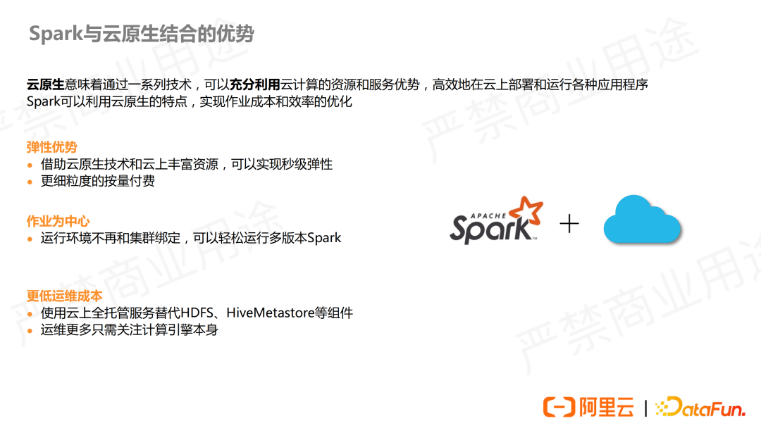 如果把 Spark 部署在云上,并且能充分利用云原生的特点,可以带来更好的效果。什么是云原生?不同组织对云原生都有一些不同的定义,对于云原生中我们可能接触到像容器化、微服务、DevOps等概念。实际上这些都是技术,但不是云原生的定义。我认为云原生就是代表着通过一些技术可以充分利用到云上的云计算资源和服务的优势,然后高效地在云上部署。因为在云上的部署就代表了在云上的海量资源都可以用到,可以按需使用。Spark 作业可以结合到这些特点,来实现对作业成本和效率的优化。