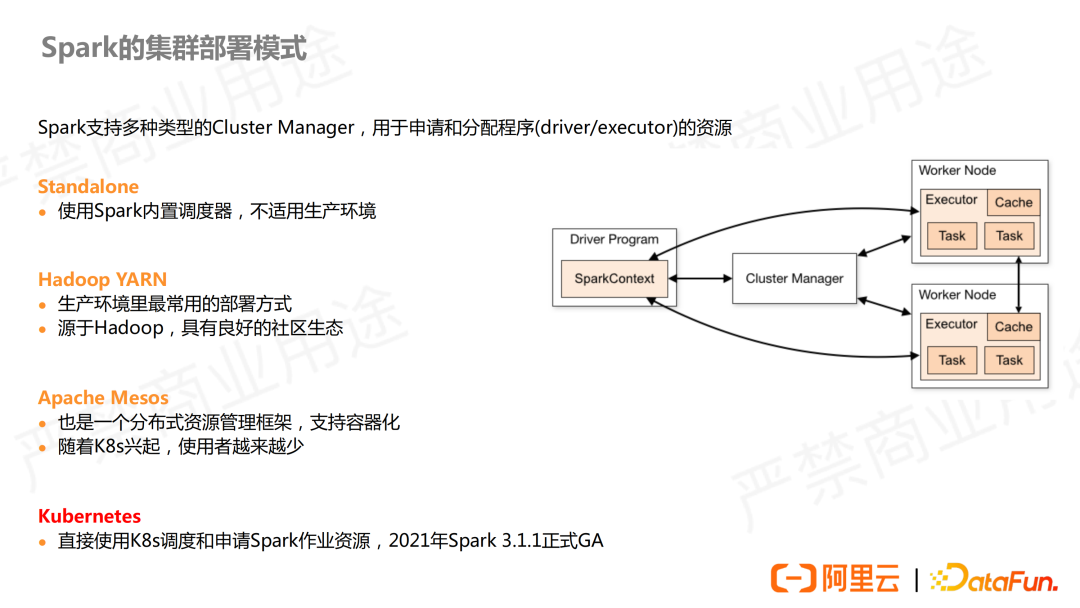 ④ Kubernetes。把 Spark 作业跑在 K8s 集群里。随着云原生趋势热度比较高,现在也有更多的用户在尝试用这种部署模式跑 Spark 作业。