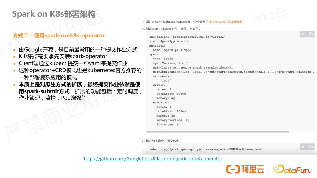 除了官方文档这种方式之外,还有一个 spark-on-k8s-operator 的模式。这个 Spark operator 是 Google 的一个开源项目(链接:https://github.com/GoogleCloudPlatform/spark-on-k8s-operator),它可以让 Spark 作业作为一种 CRD(Custom Resource Definition),用 yaml 的方式来描述,直接提交一个 yaml 文件就能提交 Spark 作业了。这种方式实际上是 spark-submit 官方方式的一种封装而已,但是它更符合我们作为用户的习惯,因为 K8s 其他的对象也都是用这种的 yaml 方式去提交的。