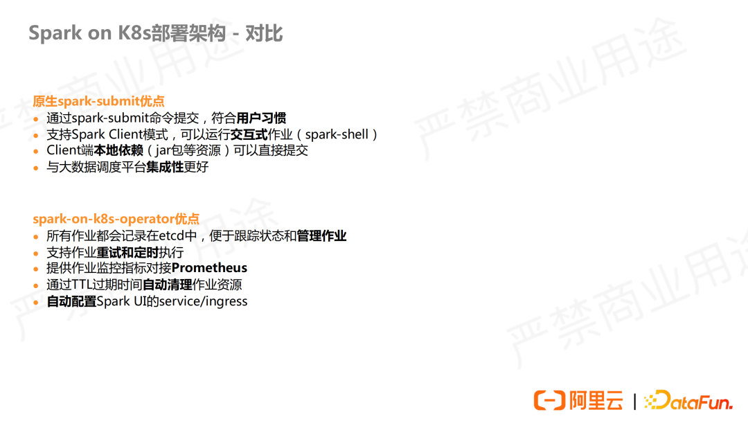简单对比一下这两种方式。spark-submit 方式是对老用户比较友好,迁移难度比较低,而且交互式作业直接就能跑起来。Spark operator 做了一些完善,在作业管理方面做了很多功能,可以自动去创建 service ingress,可以自动去清理残留的 pod,并且支持重试等等。总体来说就是这两种方式各有利弊。另外我们也提供了一种提交方式,可以结合这两个优点,后面会进行介绍。
