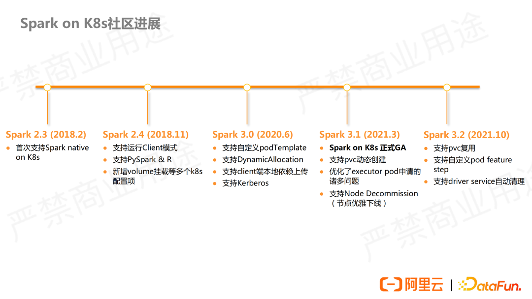 Spark 官方在 Spark 2.3 正式支持 native on K8s。之前有人尝试过在 K8s 上用Standalone 或者 YARN 模式来跑,不过都不是 native on K8s,缺点比较多。Spark 2.3 支持之后,在 2.4 有了少量的功能优化,但是真正得到完善是在 Spark 3 之后,Spark on K8s GA 是 Spark 3.1(general available,正式可用,之前都是叫experimental)。如果想要尝试在 K8s 里跑 Spark 还是选择 Spark 3 比较好,因为 Spark 2 功能和稳定性都有些不足,比如 Spark 3 的一个重要特性是支持了 K8s 的 dynamic allocation,另外还支持了自定义 pod template,提升了灵活性。