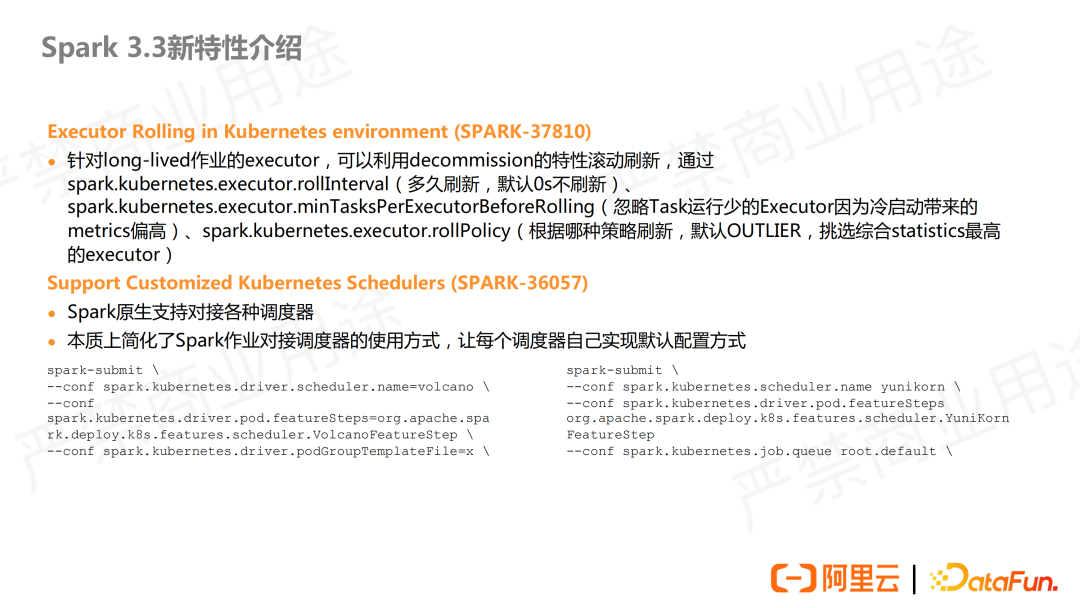 为了解决这个问题,它提供了一个叫 executor 的滚动刷新的方式,可以设置刷新的频率,刷新的策略(比如可以结合最近的统计跑 task 最慢的 executor,并重启这些 executor,实现这个 executor 定期地重新拉起)。这样,这些慢 executor 可以通过重启来避免一直拖慢后面的作业。因为重启 executor 对作业可能会有些影响,所以它需要结合 Spark 3 提供的另一个特性——decommissioning,节点优雅下线的特性,既保证这个 executor 能够重启,也不会带来 Stage 重算之类的对作业的干扰。