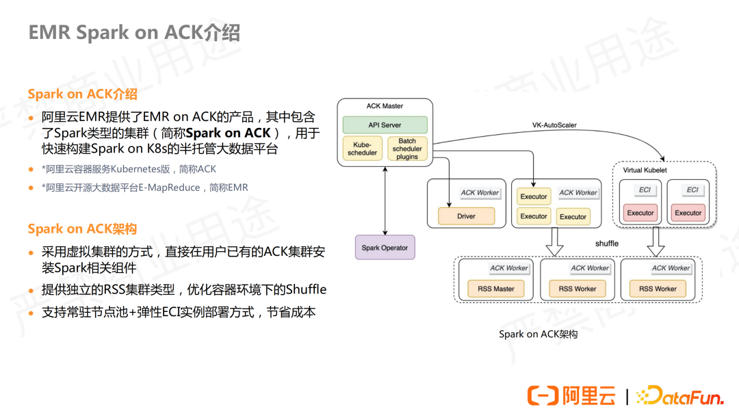 在阿里云的公共云上,有一款 EMR on ACK 的产品,其中有一个集群类型是 Spark 集群(后面简称为 Spark on ACK)。顺便提一下,这里的 ACK 是阿里容器服务 K8s 版, ACK 可以理解为 K8s 集群。Spark on ACK 其实提供了一套半托管的大数据平台,帮大家在自己的 K8s 集群里部署好 Spark 运行的环境,提供一些控制台管控之类的功能。