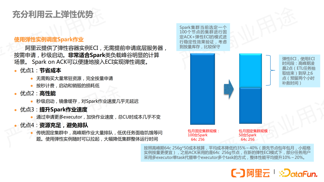 所谓的这个弹性实例(ECI)是什么?Spark 和云上结合最大的优势就是弹性比较好,可以充分利用云上的资源优势。在阿里云 K8s 环境里有一个弹性容器实例(ECI)的产品,这个产品提供了一个很好的弹性,比如如果要申请 2 核 8G的一个 pod,不再是占用自己机器节点的资源,而是完全用云上的资源帮你来去创建这个 pod,不需要感知机器了。同时可以做到快速拉起(秒级),以及按秒付费等。这样,用 ECI 来跑 Spark 作业很划算,因为通常大家用 Spark 跑批处理任务,峰谷比较明显,有的时候是人群高峰,白天可能查询比较少,这样的场景非常适合搭配这种极致的弹性。这些都可以节省很多成本,性价比非常高。