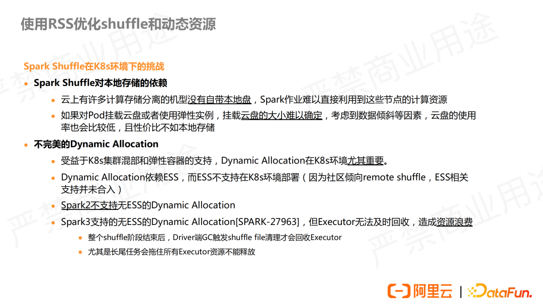 Spark 2 官方没有支持 dynamic allocation,Spark 3 GA 之后才支持在 K8s 环境里的dynamic allocation。但是 Spark 3 提供的 shuffle tracking 这个功能的 executor 回收效率比较慢,会带来资源使用的浪费,也不是一个比较完美的方案。这个是环境跑 shuffle 的一个问题。