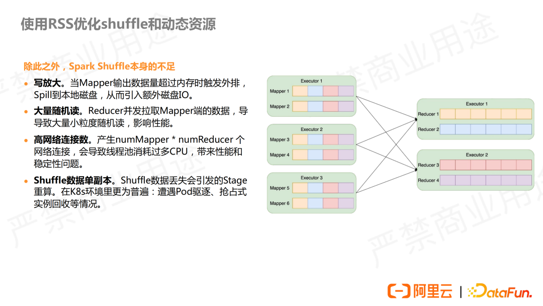 针对这两类问题,阿里云提供了一个叫做 RSS(Remote Shuffle Service)(链接:https://github.com/alibaba/celeborn)的服务,目前已经在 GitHub 上开源了。原来的 Spark Shuffle 数据是保存在本地磁盘的,用了 RSS 之后,Shuffle 数据就交给 RSS 来管理,executor 直接把数据推给 RSS,本地就不需要占用很大的磁盘空间了。这种用外部 Shuffle Service 的模式在业界已经是一个比较流行的一个共识,很多公司都有在做这方面的优化,只不过 Spark 还没有提供一个官方的方式。