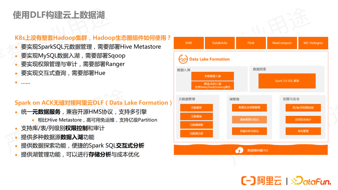 在 K8s 上大家不会部署完整的 Hadoop 集群,比如 HDFS,会用对象存储 OSS 来做替代,还有很多其他组件可能用到,比如用 Hive Metadata 保存元数据,用 Sqoop 做数据导入等。在云上构建大数据平台是比较复杂的,Spark 也依赖很多这些组件,这些问题都可以用云上的全托管服务 DLF,它可以提供统一的元数据权限控制,这样 Spark 就不需要自己再维护 Hive Metastore ,可以直接对接 DLF 做元数据管理,免去了很多组建运维的问题,并且用户也可以借此来快速上手,是引擎的一个很好的搭档。