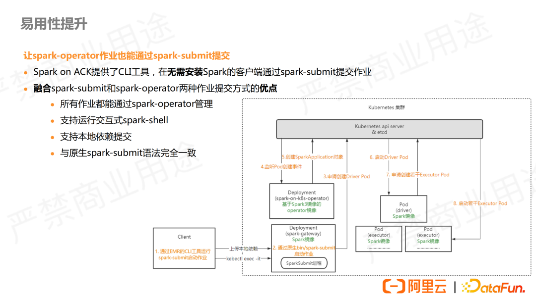 具体原理其实就是在我们在集群提交作业到 Spark Pod 的时候,我们会去反向监听这个Pod 创建,然后再注册回 Spark operator。这里也是用我们内部改造过的 Spark operator 来做这个功能。这对用户来说较大地提升了易用性。