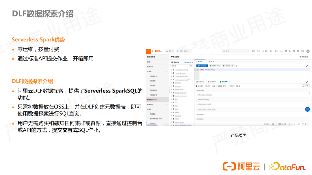 刚才提到的 Spark on K8s 的形态还是需要用户去感知、运维K8s 集群,是一种半托管的形态。云上 serverless Spark 的形态意味着用户无需要感知任何机器节点,可以直接通过标准的 API 方式提交作业。所谓 Serverless Spark 就是说用户完全不需要买机器了,按作业去付费就可以,这种形态很适合中小型的客户。阿里云 DLF 除了提供之前描述的元数据等等这些湖管理的功能以外,还有一个叫数据探索的功能。这个功能是一个标准的 Serverless Spark SQL,可以用来跑交互式查询。我们只要把数据放到 OSS 上,然后在 DLF 建好表格,就可以直接使用 SQL,并在控制台上进行交互式查询。图中右侧是我们实际的产品截图是一个标准的 SQL 工作台,用户可以直接在这里做一些分析查询。