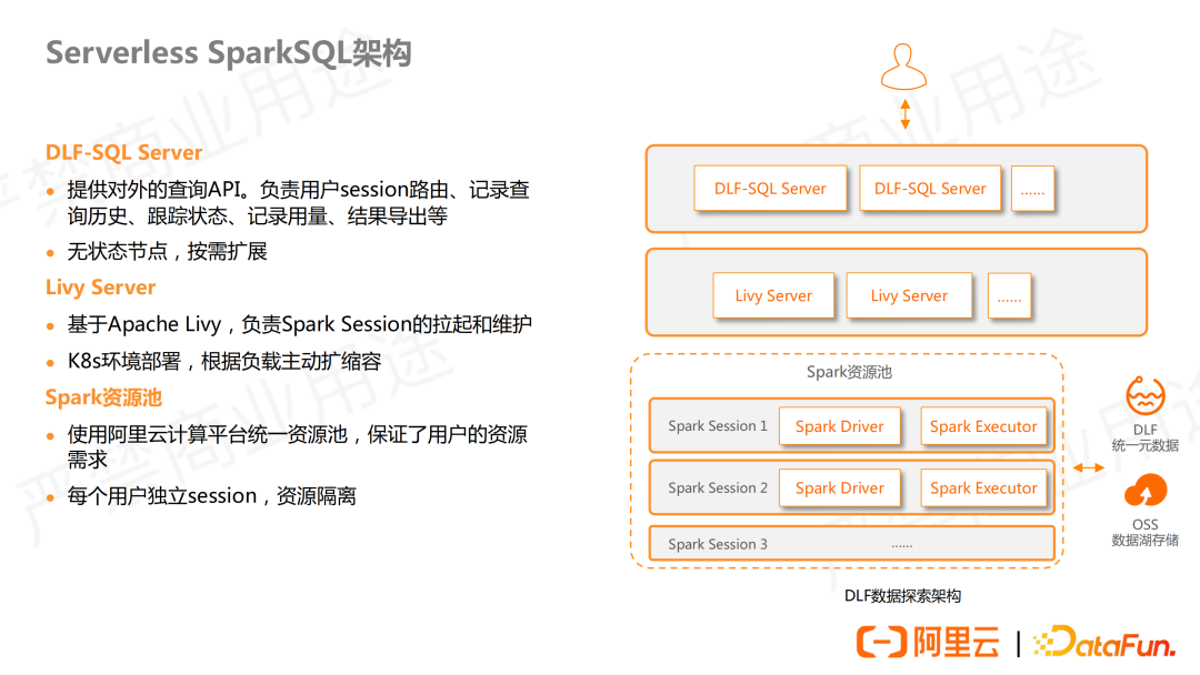 在架构里,最上层是 DLF-SQL Server,它是一个管控服务,对外提供查询 API,是一个无状态的在线服务。下面一层是利用了 Apache Livy 来去做交互式查询的会话创建和维护,这一层部署在 K8s 环境里,会根据负载扩缩容。最下层 Spark 跑在内部的机器资源池里,阿里云内部有一些统一的资源池,这个资源池是我们和阿里云 Max Compute 共享的机器资源,可以最大程度保障用户资源的需求,对于每个用户的 SQL 查询都会提供独立的 Spark session,这样就意味着它们是不同的 Spark application,可以使隔离性和安全性得到保证。