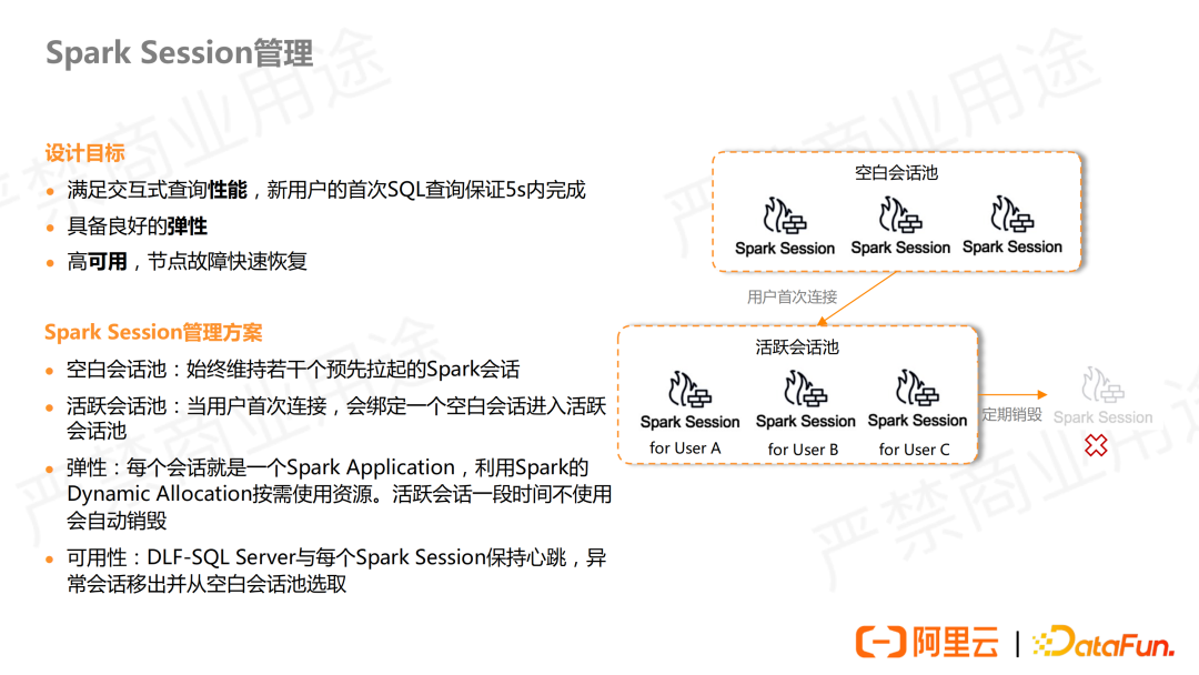 对于交互式查询,我们设计上有几个目标:既要保证用户查询能够快速返回,用户提交的短查询,我们希望至少在几秒一定要能返回。另外也要保证内部资源不要做到浪费。因此我们需要对这些 Spark session 做好管理。