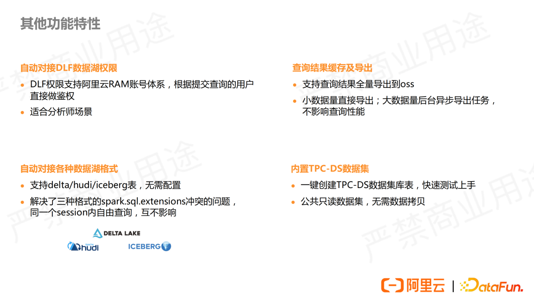 为了保证用户体验,在功能细节上也做了很多配置和优化。比如权限这块,我们对接DLF 权限,用户阿里云子账号登录上来之后,自动去根据用户的子账号去做鉴权,只能查询自己有权限的 table,很适合分析师在阿里云上开几个子账号,分别去做数据分析的这种场景,我们也有一些用户就是这么用的。