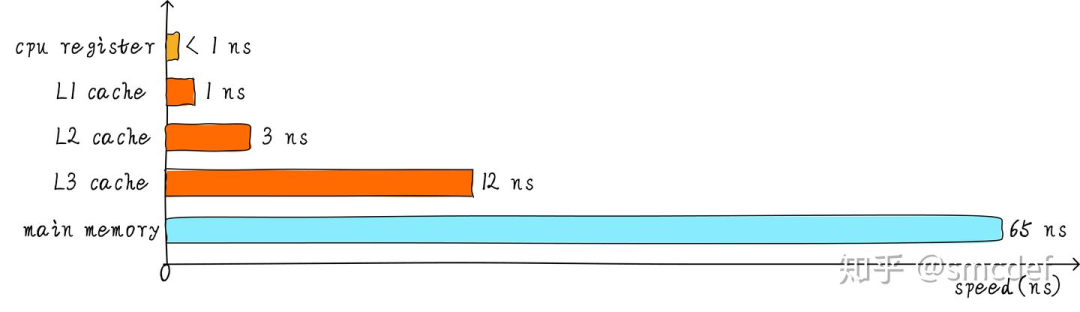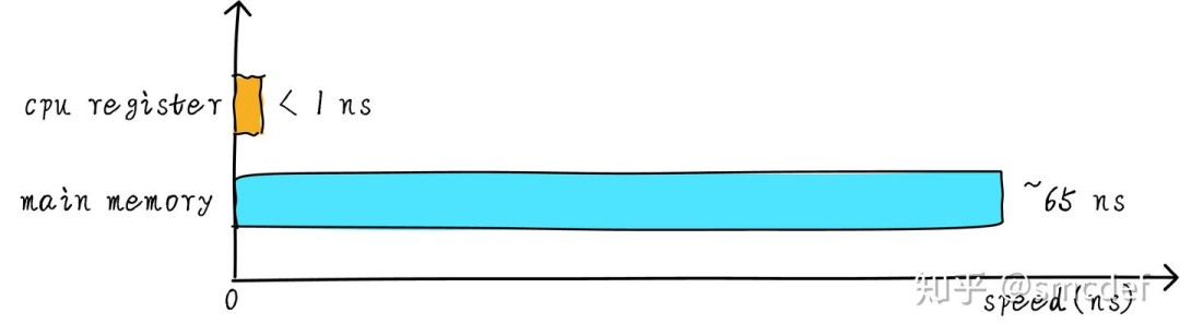 其实现实中,CPU通用寄存器的速度和主存之间存在着太大的差异。两者之间的速度大致如下关系: