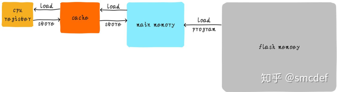 CPU register的速度一般小于1ns,主存的速度一般是65ns左右。速度差异近百倍。在硬件上,我们将cache放置在CPU和主存之间,作为主存数据的缓存。当CPU试图从主存中load/store数据的时候, CPU会首先从cache中查找对应地址的数据是否缓存在cache 中。如果其数据缓存在cache中,直接从cache中拿到数据并返回给CPU。当存在cache的时候,以上程序如何运行的例子的流程将会变成如下: