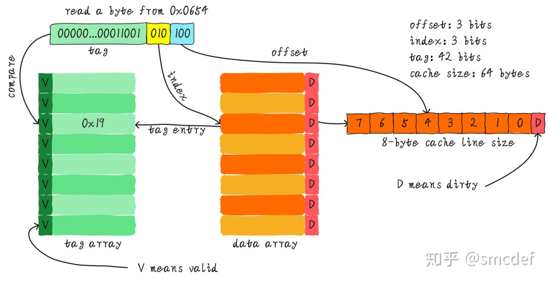 我们一共有8行cache line,cache line大小是8 Bytes。所以我们可以利用地址低3 bits(如上图地址蓝色部分)用来寻址8 bytes中某一字节,我们称这部分bit组合为offset。同理,8行cache line,为了覆盖所有行。我们需要3 bits(如上图地址黄色部分)查找某一行,这部分地址部分称之为index。现在我们知道,如果两个不同的地址,其地址的bit3-bit5如果完全一样的话,那么这两个地址经过硬件散列之后都会找到同一个cache line。所以,当我们找到cache line之后,只代表我们访问的地址对应的数据可能存在这个cache line中,但是也有可能是其他地址对应的数据。所以,我们又引入tag array区域,tag array和data array一一对应。每一个cache line都对应唯一一个tag,tag中保存的是整个地址位宽去除index和offset使用的bit剩余部分(如上图地址绿色部分)。tag、index和offset三者组合就可以唯一确定一个地址了。因此,当我们根据地址中index位找到cache line后,取出当前cache line对应的tag,然后和地址中的tag进行比较,如果相等,这说明cache命中。如果不相等,说明当前cache line存储的是其他地址的数据,这就是cache缺失。
