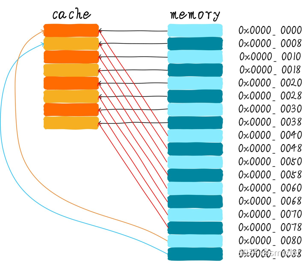 因此,两路组相连缓存较直接映射缓存最大的差异就是:第一个地址对应的数据可以对应2个cache line,而直接映射缓存一个地址只对应一个cache line。那么这究竟有什么好处呢?