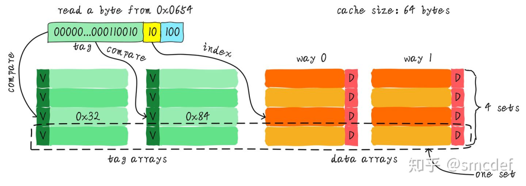 cache被分成2路,每路包含4行cache line。我们将所有索引一样的cache line组合在一起称之为组。例如,上图中一个组有两个cache line,总共4个组。我们依然假设从地址0x0654地址读取一个字节数据。由于cache line size是8 Bytes,因此offset需要3 bits,这和之前直接映射缓存一样。不一样的地方是index,在两路组相连缓存中,index只需要2 bits,因为一路只有4行cache line。上面的例子根据index找到第2行cache line(从0开始计算),第2行对应2个cache line,分别对应way 0和way 1。因此index也可以称作set index(组索引)。先根据index找到set,然后将组内的所有cache line对应的tag取出来和地址中的tag部分对比,如果其中一个相等就意味着命中。
